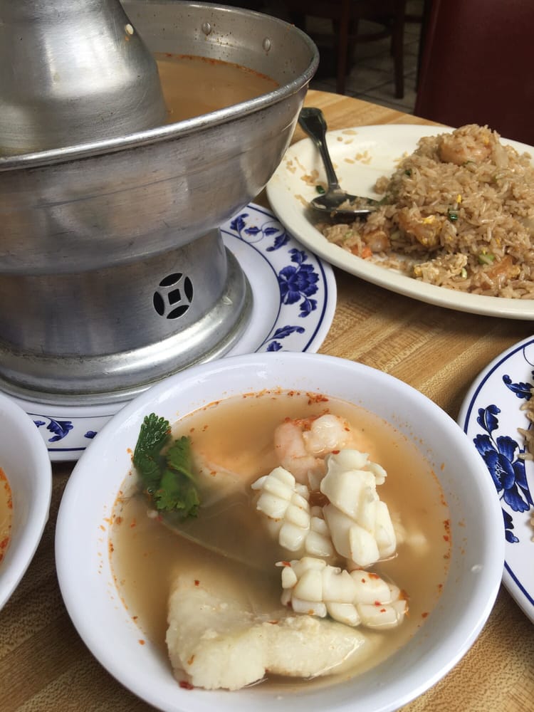 Sopa de mariscos. Combination of shrimp, squid, fish and mussels in a spicy lime soup. Combinacion de camarones, calamar, pescado, almejas en sapa condimentada con hierbas Thai.